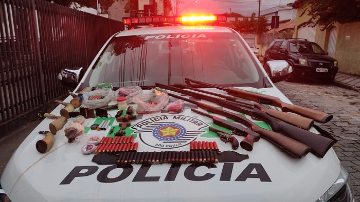 O proprietário não estava no local, mas foi acionado vila telefone por sua esposa e compareceu na residência, onde confirmou ser dono das armas e do atericiai encontrado, sendo dado voz de prisão e conduzido juntamento com o material apreendido para o distrito Policial de Lorena.