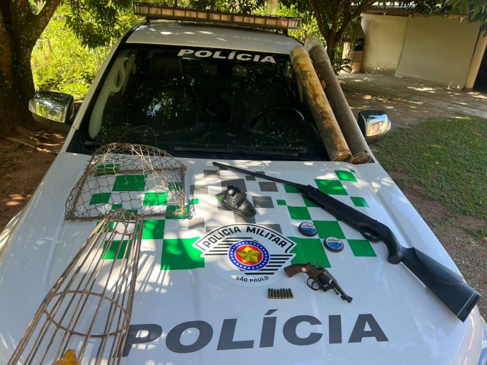 A Polícia Militar Ambiental apreendeu, nesta terça-feira (27), armas e materiais utilizados para caça ilegal em uma residência no bairro Santa Terezinha, em Silveiras (SP). A ação foi conduzida pelo Grupamento Tático da corporação, após denúncia anônima sobre a suposta posse irregular de arma de fogo e abate de animais silvestres no local.