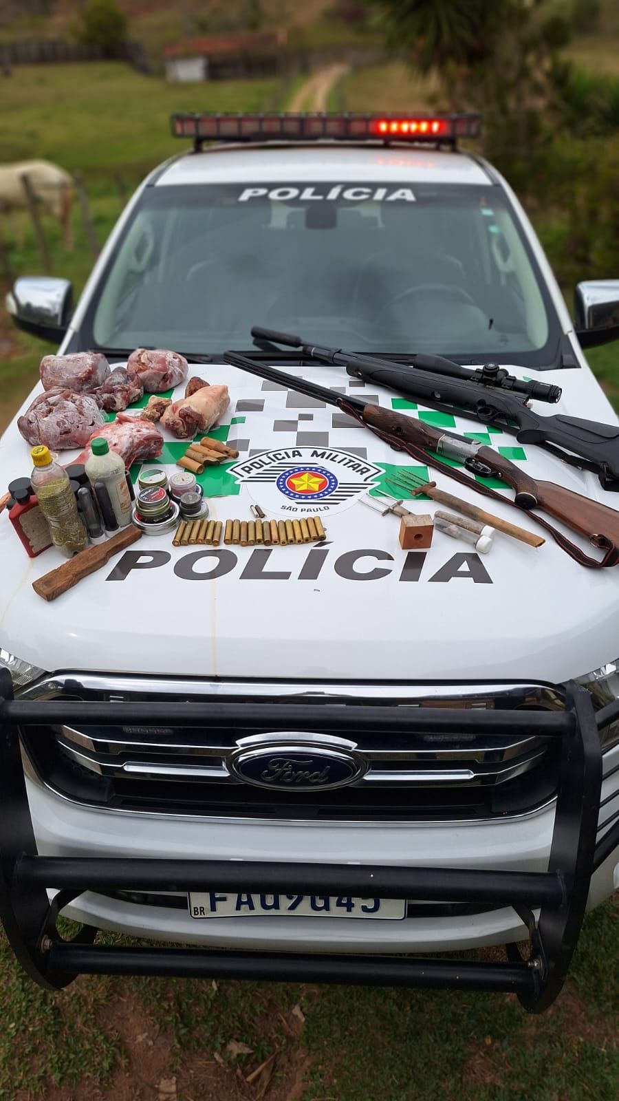 Equipes do Grupo Especial de Policiamento Ambiental em Área de Risco (GEPAAR) atenderam denúncia de caça com uso de arma de fogo no bairro da Rocinha, em Guaratinguetá. No local, os policiais encontraram armas, munições e partes de animais silvestres abatidos em duas residências.