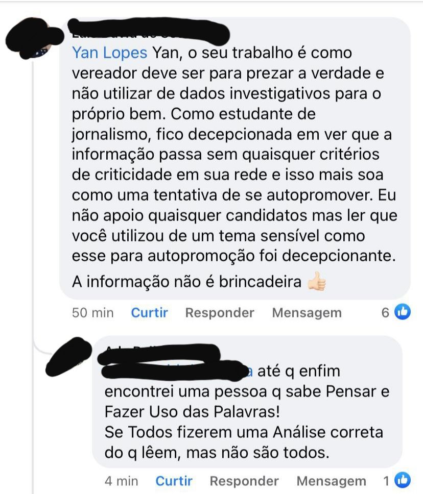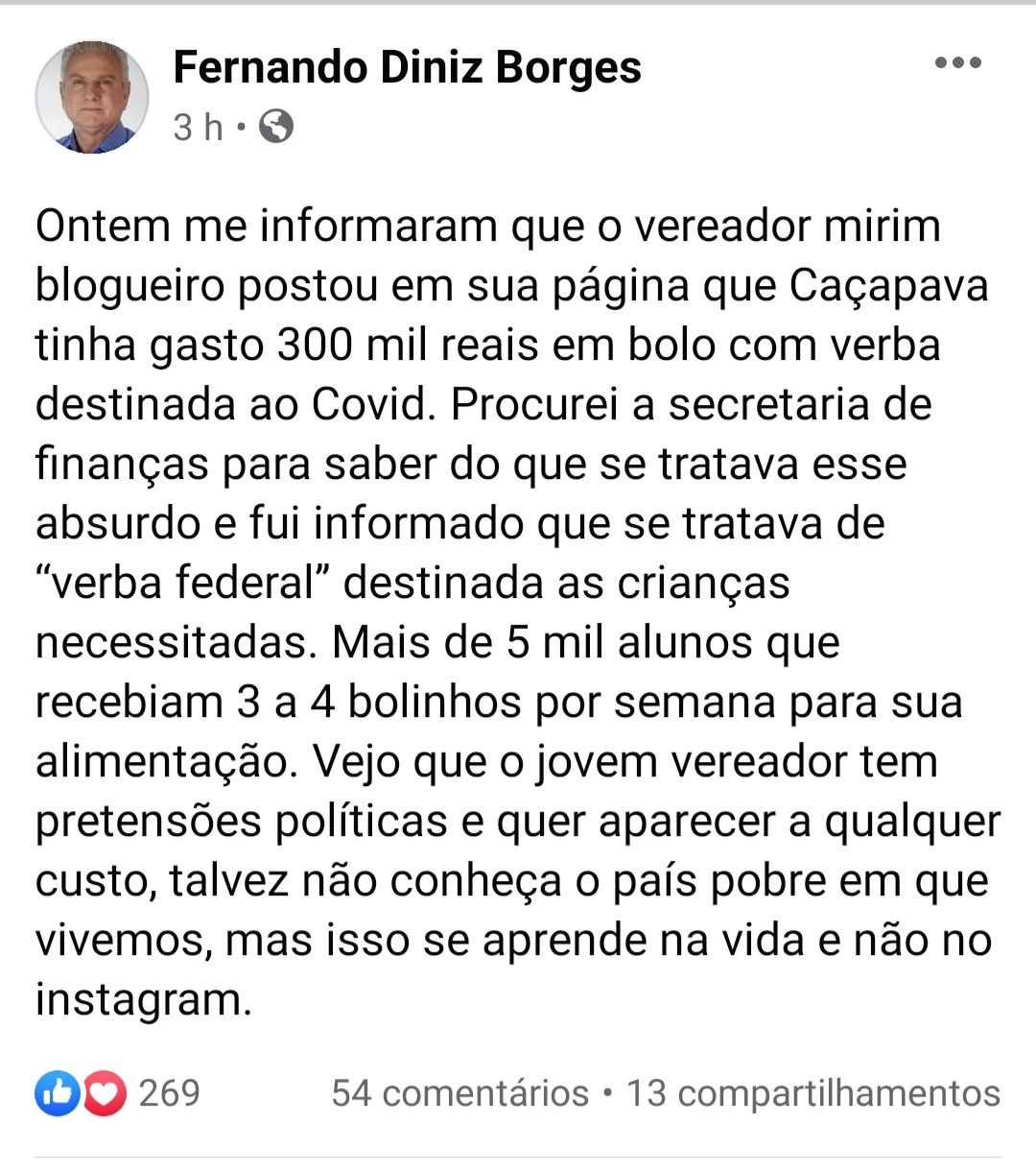 O ex-prefeito de Caçapava, Fernando Diniz, disse através de suas redes sociais que o vereador teria pretensões políticas e que por isso quer aparecer a qualquer custo. "Ontem me informaram que o vereador mirim blogueiro postou em sua página que Caçapava tinha gasto 300 mil reais em bolo com verba destinada ao Covid. Procurei a secretaria de Finanças para saber do que se tratava esse absurdo e fui informado que se tratava de 'verba' federal, destinada às crianças necessitadas. Mais de 5 mil alunos recebiam de 3 a 4 bolinhos por semana para sua alimentação. Vejo que o jovem vereador tem pretensões políticas e quer aparecer a qualquer custo, talvez não conheça o país pobre em que vivemos, mas isso se aprende na vida e não no Instagram", disse Diniz.