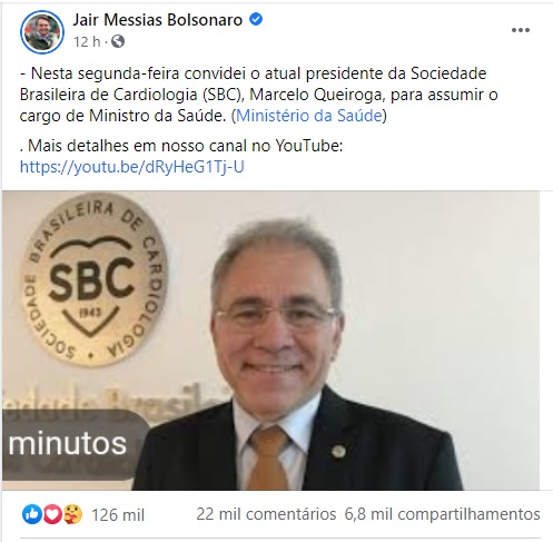 "Foi decidido agora a tarde a indicação do médico Marcelo Queiroga para o Ministério da Saúde. Ele é presidente da Sociedade Brasileira de Cardiologia. A conversa foi excelente, já o conhecia há alguns anos então não é uma pessoa que tomei conhecimento há poucos dias, e tem, no meu entender, tudo para fazer um bom trabalho dando prosseguimento em tudo que Pazuello fez até hoje", afirmou Bolsonaro na conversa transmitida pelo site Foco do Brasil, mantido por apoiadores do presidente.