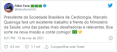 Nas redes sociais, o ministro das Comunicações, Fábio Faria, também comentou a indicação de Queiroga, classificando o Ministério da Saúde como "uma das pastas mais desafiadoras e relevantes" do governo.