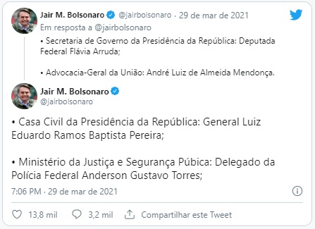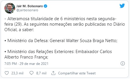 O presidente confirmou as mudanças nas redes sociais e informou que as nomeações serão publicadas no Diário Oficial da União.