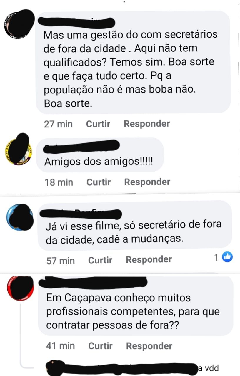 Vários comentários foram feitos abaixo do vídeo que a prefeita postou em sua rede social apresentando a nova secretária. Teve quem parabenizou e teve quem criticou. "Já vi esse filme, só secretário de fora da cidade, cadê a mudanças (sic)", disse um internauta. "Porque não colocar pessoas qualificadas de Caçapava? Porque tem que ser de fora?", disse outra usuária. "Em Caçapava conheço muitos profissionais competentes, para que contratar pessoas de fora?(sic)", questionou outro.