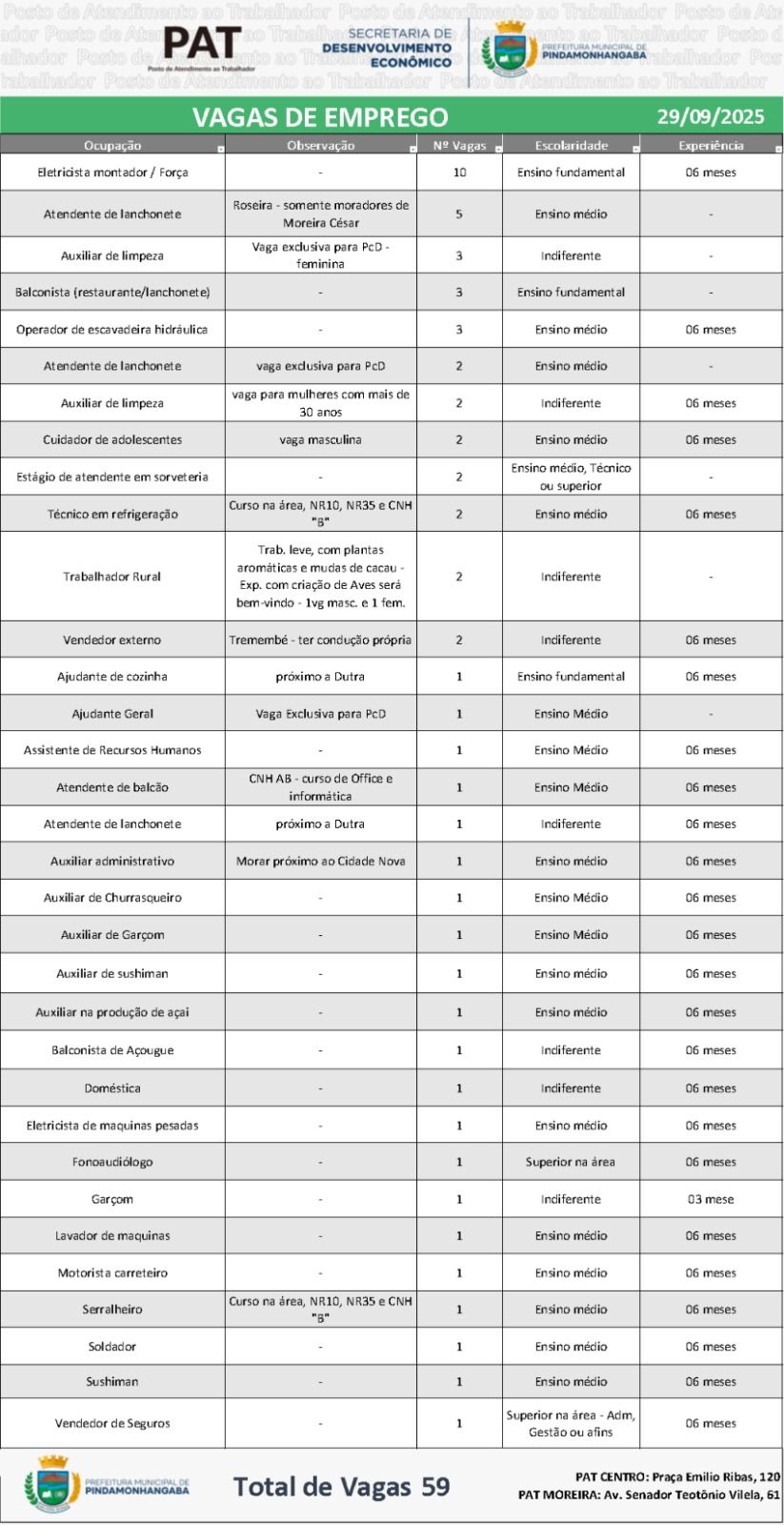 O Posto de Atendimento ao Trabalhador (PAT) de Pindamonhangaba está com 59 vagas de emprego abertas em diferentes setores. As oportunidades são destinadas a candidatos com variados níveis de escolaridade e experiência, incluindo vagas exclusivas para pessoas com deficiência (PcD).