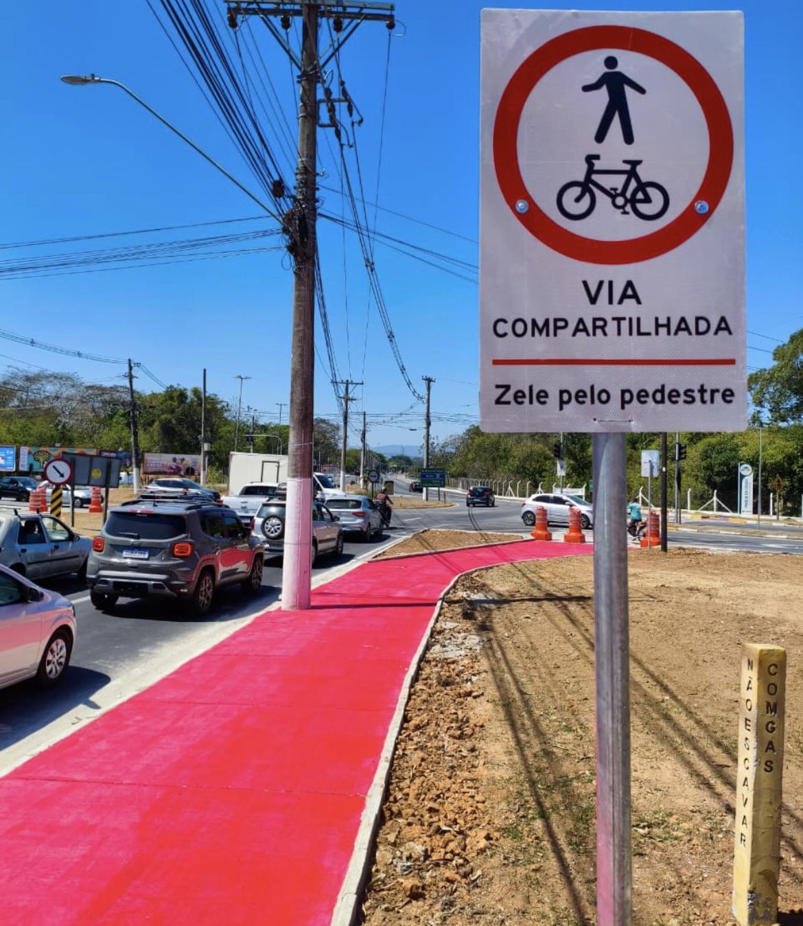 A ciclofaixa da Avenida Professor Manoel César Ribeiro, em Pindamonhangaba, está sendo transformada em calçada compartilhada para pedestres e ciclistas. A mudança, prevista no Código de Trânsito Brasileiro e devidamente sinalizada com placas e pinturas, é necessária para viabilizar a abertura de uma nova faixa de rolamento, destinada à construção da quarta e última alça de acesso livre na rotatória do Tenda.