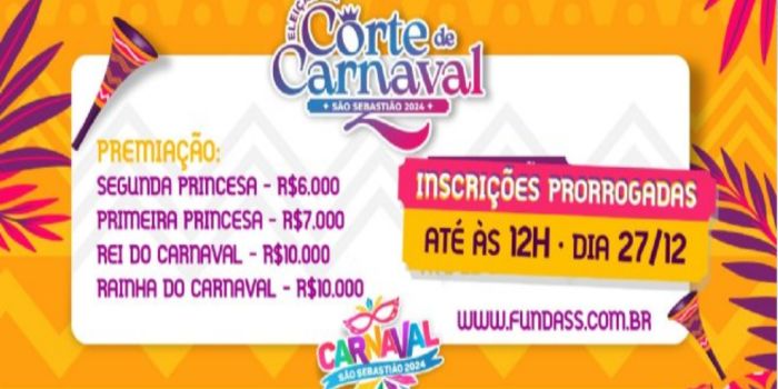 A Prefeitura de São Sebastião, por meio da Secretaria de Turismo (SETUR), em parceria com a Fundação Educacional e Cultural 'Deodato Sant'Anna' (Fundass), prorrogou as inscrições da Eleição da Corte do Carnaval de São Sebastião 2024 para até às 12h do dia 27 de dezembro.