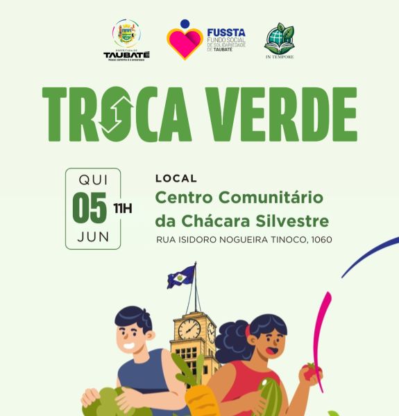 O Fundo Social de Solidariedade de Taubaté (Fussta) realiza nesta quinta-feira (5), das 9h às 13h, o projeto-piloto do programa Troca Verde no Centro Comunitário do bairro Chácara Silvestre, localizado na Rua Isidoro Nogueira Tinoco, 1060.