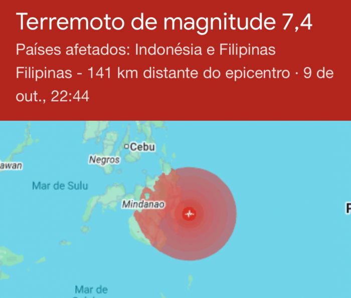 As autoridades das Filipinas emitiram um alerta de tsunami depois que um forte terremoto de magnitude 7,4 atingiu o sul do arquipélago nesta sexta-feira (10), provocando temor de destruição e novas réplicas. O tremor foi sentido na grande ilha de Mindanau, a segunda maior do país, por volta das 9h43 no horário local (22h43 de quinta-feira em Brasília).