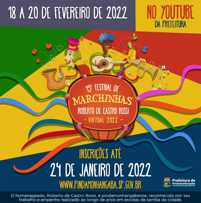 A partir desta sexta-feira (10) abre as inscrições para o 15° Festival de Marchinhas Carnavalescas de Pindamonhangaba. As inscrições devem ser feitas por meio do link, e seguem até o dia 24 de janeiro de 2022.