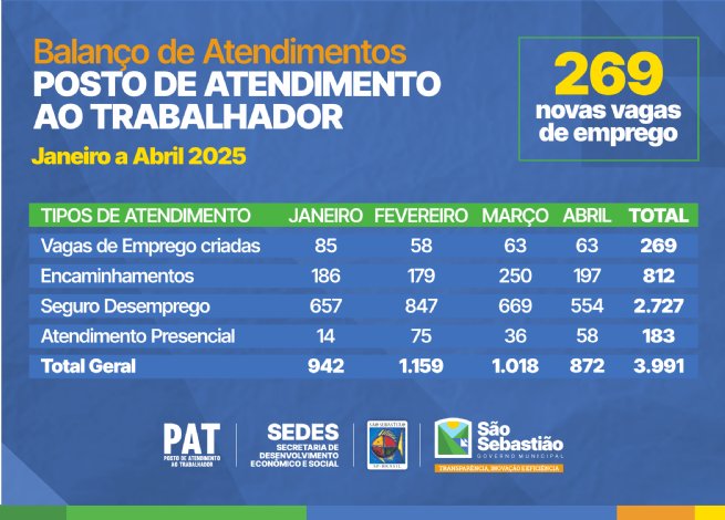 Com foco na retomada econômica, empregabilidade e no fortalecimento da renda das famílias sebastianenses, a Prefeitura de São Sebastião, por meio da Secretaria de Desenvolvimento Econômico e Social (Sedes), divulgou o balanço de atendimentos realizados pelo Posto de Atendimento ao Trabalhador (PAT) - Região Central, entre os meses de janeiro e abril de 2025.