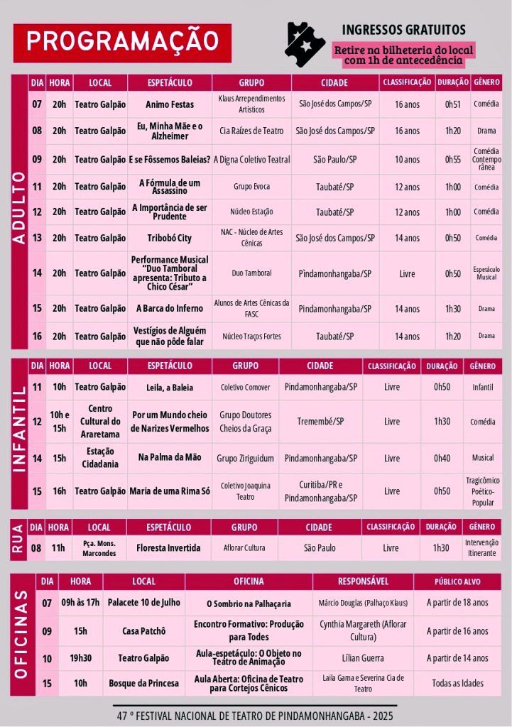 Entrada franca Todas as sessões do Feste têm entrada gratuita, com ingressos retirados na bilheteria dos locais uma hora antes das apresentações, reforçando a proposta de democratizar o acesso ao teatro e aproximar ainda mais a população das artes cênicas. Nesta página especial, o público poderá conferir a programação completa e uma seleção de fotos dos principais espetáculos, registrando em imagens a força do teatro que, ano após ano, faz do Feste um patrimônio afetivo e cultural de Pindamonhangaba.