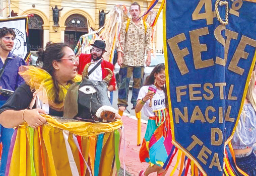 Apresentação Externa Levar o teatro para além das salas fechadas é outra marca do evento. Neste ano, o Teatro de Rua está representado por "Floresta Invertida", intervenção itinerante do grupo Aflorar Cultura, de São Paulo, apresentada na Praça Monsenhor Marcondes. O espetáculo convida o público a caminhar pela cidade guiado por imagens de rios ocultos, raízes invisíveis e figuras fantásticas, conectando corpo, memória, feminino e natureza em um percurso sensorial.
