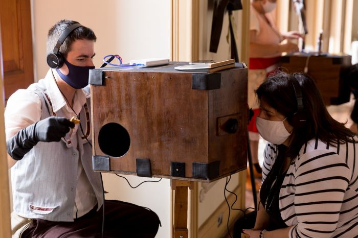 "A técnica é inspirada nos fotógrafos lambe-lambes, que utilizavam máquinas fotográficas em formato de caixas. Assim, o espetáculo é visto por um furo feito na caixa cênica. que permite espiar essa 'realidade em miniatura", explica o ator e produtor executivo Ricardo Salem. Cibele Tomaz, Vivian Rau e Izildinha Costa completam o elenco.