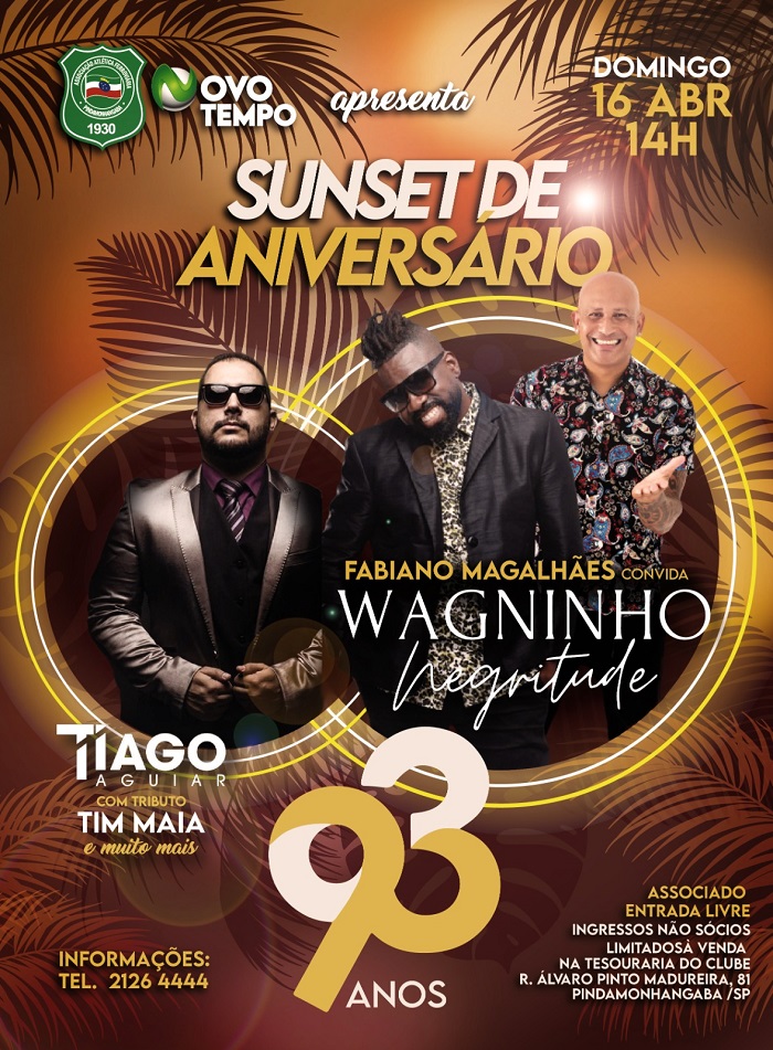 A grande festa de aniversário será no dia 16, domingo, a partir das 14h, com Fabiano Magalhães, Wagninho (ex-Negritude) e Tiago Aguiar (Tributo a Tim Maia). Ingressos para não associados estão sendo vendidos na tesouraria do clube por R$15.
