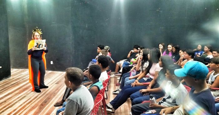 A Biblioteca Araretama recebeu, na última semana, 68 alunos dos 6º anos da Escola Estadual Bem Viver para uma atividade especial de contação de história e oficina teatral. A ação contou com a participação de sete professores, incluindo os educadores de teatro Wilson e André, que conduziram dinâmicas em grupo com os estudantes.