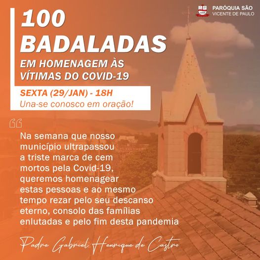 "Na semana que nosso município ultrapassou a triste marca de cem mortos pela Covid-19, queremos homenagear estas pessoas e ao mesmo tempo rezar pelo seu descanso eterno, consolo das famílias enlutadas e pelo fim desta pandemia", explica o administrador paroquial, padre Gabriel Henrique de Castro.