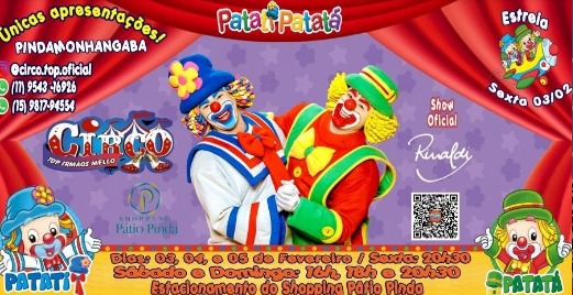 O Shopping de Pindamonhangaba recebe, nesta sexta-feira (3), um circo com diversas apresentações especiais e shows dos palhaços Patati e Patatá para toda a família.