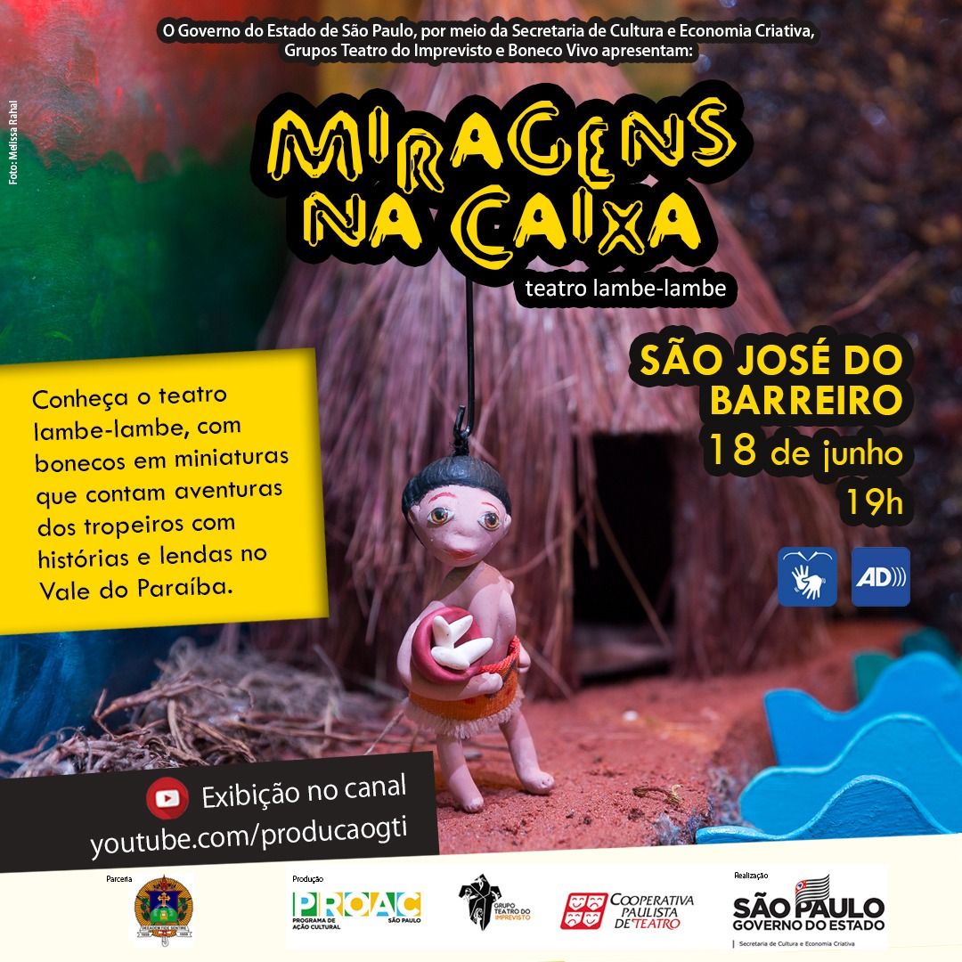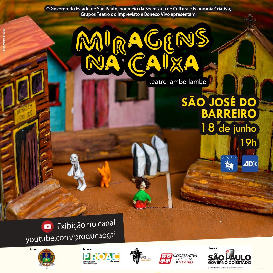 O projeto "Miragens na Caixa" foi lançado em setembro do ano passado, em formato online, por conta da pandemia de covid-19. Além das apresentações, que contemplaram diferentes cidades nas regiões do Vale do Paraíba, Vale Histórico e Serra da Mantiqueira, foi realizada uma oficina de teatro lambe-lambe, com Gustavo Guimarães, do grupo Ciclistas Bonequeiros. Essa atividade resultou na produção de oito mini-espetáculos pelos alunos, que participarão de um bate-papo online sobre o processo criativo logo após a mostra, neste sábado, a partir das 19h, também pelo canal do GTI no Youtube.