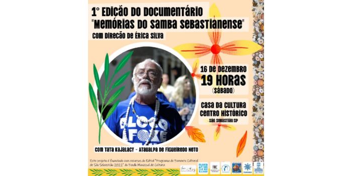 O Espaço Cultural Ateliê Érica Silva Produções estreia a exibição da 1ª Edição do documentário 'Memórias do Samba Sebastianense', neste sábado (16), às 19h, na Casa de Cultura de São Sebastião, no Centro Histórico.