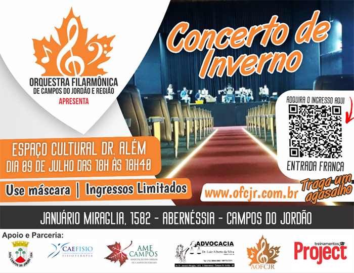 Nesta sexta-feira (9), a partir das 18h, o Espaço Cultural Dr Alem abre suas portas para receber o concerto de inverno da Orquestra Filarmônica de Campos do Jordão e Região. O gratuito de 40 minutos, além de apresentar ao público alguns de seus músicos, servirá também para receber doação de agasalhos para o Fundo Social de Solidariedade do Município.