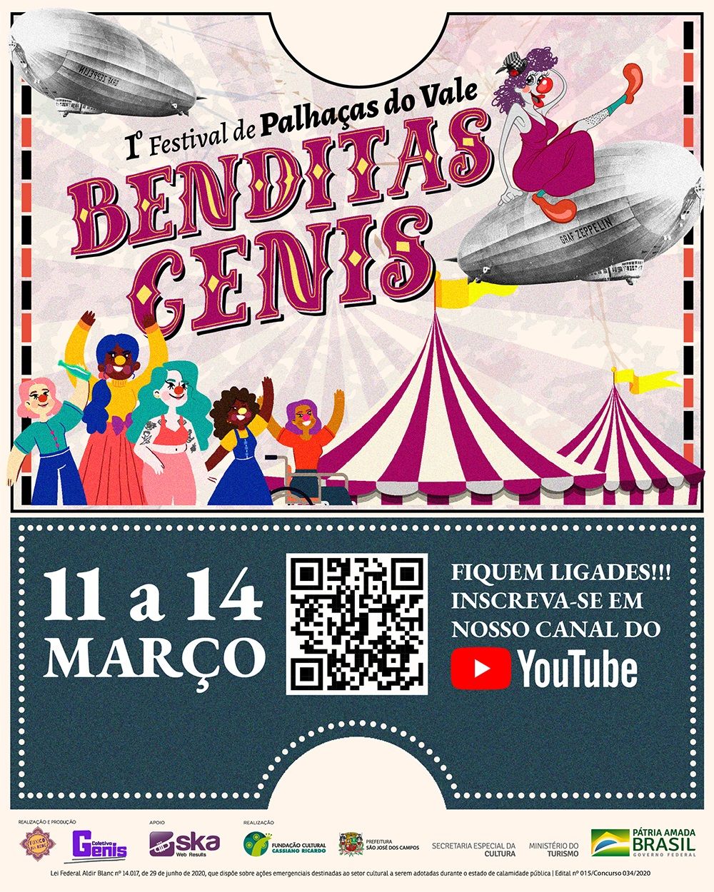 Promovido pelo coletivo "Benditas Genis" o festival tem como objetivo o fomento e a difusão online da produção artística de palhaças do Vale do Paraíba e do Brasil e irá selecionar até 10 números cômicos de curta duração para compor os cabarés "Noite das Desvairadas" e "Cabaré Não mexe comigo". Para se inscrever as interessadas devem acessar o link do formulário, os números podem ter temas livres e duração de até 5 minutos com foco no universo da palhaçaria.