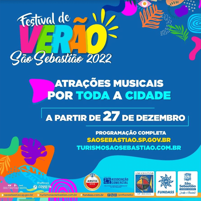 A Prefeitura de São Sebastião, por meio da Secretaria de Turismo (SETUR) e da Fundação Educacional e Cultural "Deodato Sant'Anna" (Fundass), com patrocínio da Amstel, apresenta em 10 pontos da cidade, o Festival de Verão com shows de diversos artistas locais, a partir de segunda-feira (27).