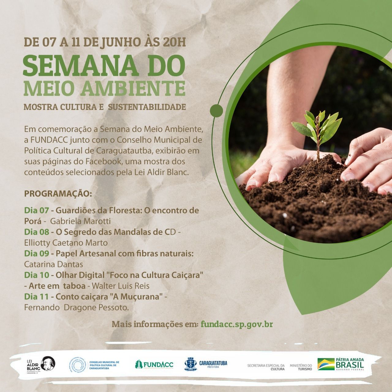 A Fundação Educacional e Cultural de Caraguatatuba (FUNDACC) e o Conselho Municipal de Política Cultural de Caraguatatuba (CMPCC) apresentam 'Semana do Meio Ambiente - Mostra de Cultura e Sustentabilidade', de 7 a 11 de junho, às 20h, pelo Facebook da fundação e do conselho. A mostra é composta por conteúdos diversos contemplados pela Lei Aldir Blanc em Caraguatatuba e é realizada em comemoração ao Mês do Meio Ambiente e Ecologia.