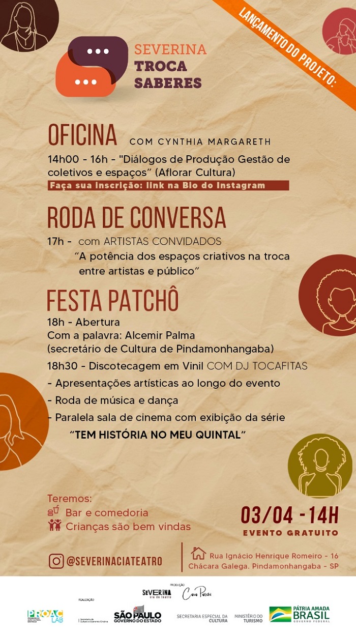No próximo domingo (3), o grupo Severina Cia de Teatro vai lançar o projeto Severina Troca Saberes. O evento vai acontecer das 14h às 22h, na Casa Patchô, sede do grupo, que fica na Rua Ignácio Henrique Romeiro, nº16, Chácara Galega - Pindamonhangaba.