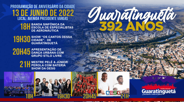 A estância turística de Guaratinguetá completa 392 anos de emancipação político-administrativa no dia 13 de junho e para comemorar a data, uma programação especial foi elaborada pela prefeitura municipal.