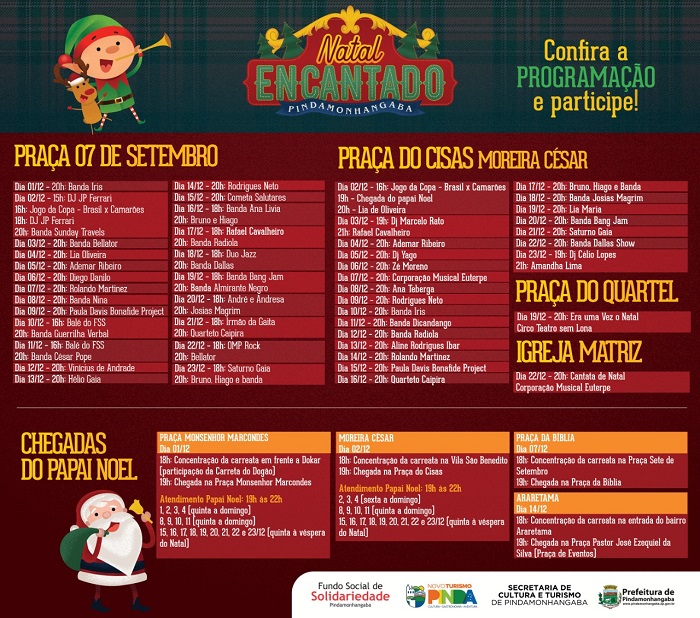 Papai Noel - Estão programadas quatro chegadas do Papai Noel e sua turma a Pindamonhangaba. A primeira, que abre o Natal Encantado, no dia 1º, mas também uma chegada na Praça do Cisas em Moreira César no dia 2 de dezembro, com carreata saindo às 18 horas da Praça Cícero Prado (Vila São Benedito). Outra chegada será no dia 7 de dezembro, na Praça da Bíblia, com saída da carreata da Praça Sete de Setembro também às 18 horas; e no dia 14, com concentração na entrada do bairro Araretama, às 18 horas, e chegada na Praça Pastor José Ezequiel da Silva (Praça de Eventos).