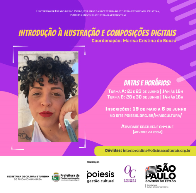A Prefeitura de Pindamonhangaba por meio da Secretaria de Cultura e Turismo, apresenta a segunda parte das oficinas culturais da Organização Social Poiesis para o mês de junho.