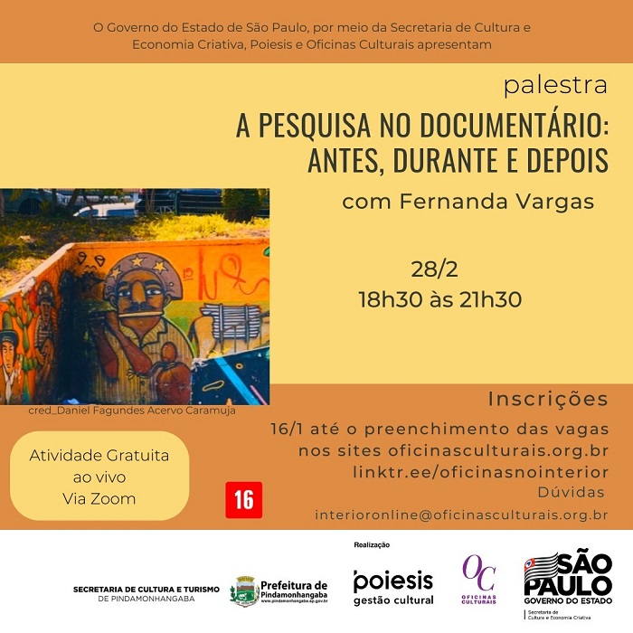 Palestra: A Pesquisa no Documentário: Antes, Durante e Depois Data: 28 de fevereiro, das 18h30 às 21h30. São 20 vagas disponíveis.