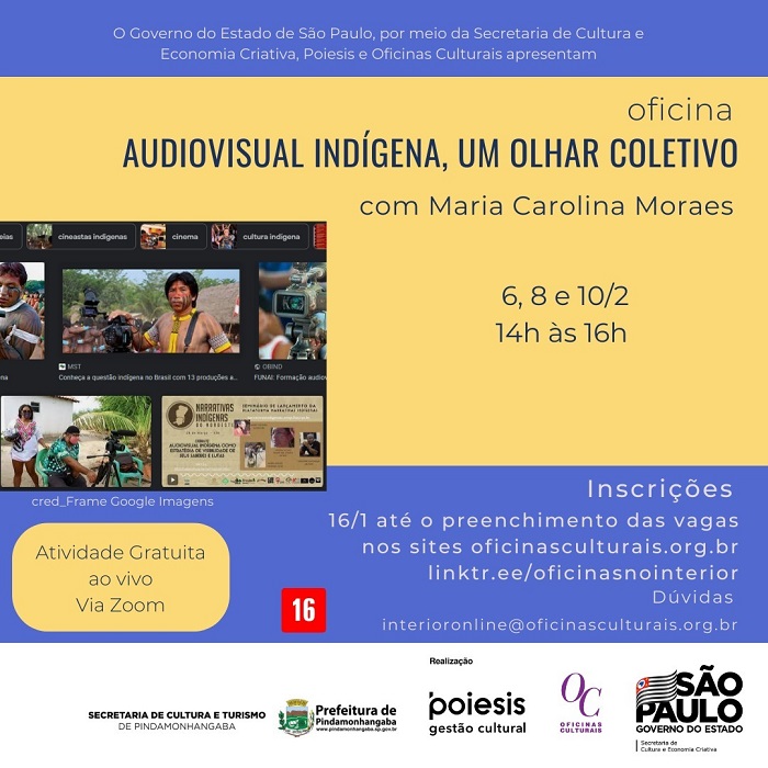 Oficina: Audiovisual Indígena - Um Olhar Coletivo Datas: 6, 8 e 10 de fevereiro, das 14 às 16 horas. São 50 vagas disponíveis.