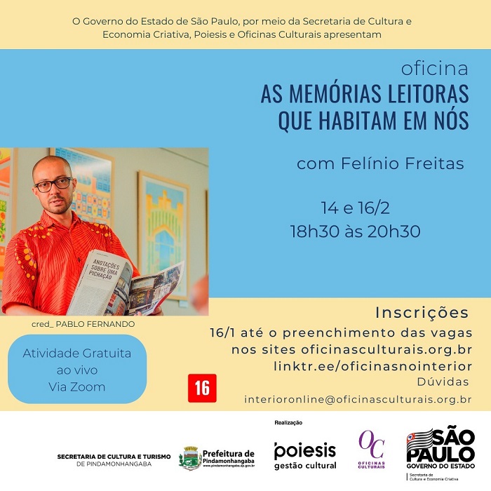 A Prefeitura de Pindamonhangaba, por meio da Secretaria de Cultura e Turismo, está realizando várias oficinas do Poiesis no mês de fevereiro. As oficinas são gratuitas e as inscrições devem ser feitas através dos links.