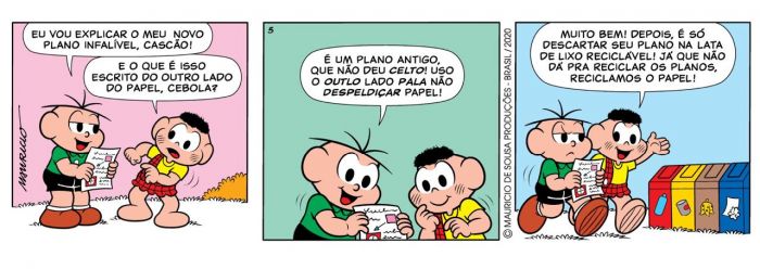 Os gibis digitais recebem os títulos "Cuidando do Mundo", "Sede de Vitória" e "Uso Racional da Água e Saneamento Básico". As histórias trazem os personagens Mônica, Cebolinha, Magali e Cascão aprendendo e ensinando de forma simples sobre a importância das redes de esgoto e de água e do descarte correto do lixo.