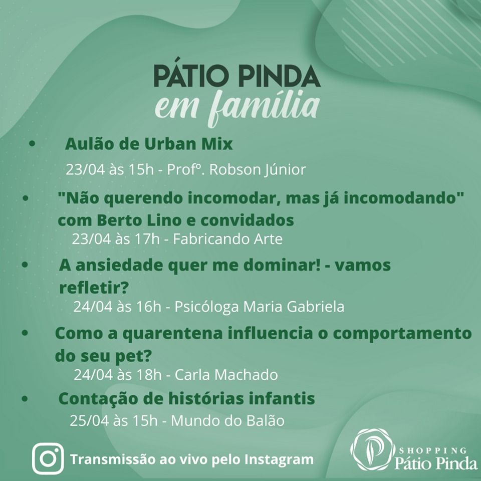 A programação é divulgada semanalmente nos canais oficiais do Shopping Pátio Pinda e nesta semana já estão confirmadas atrações infantis, contação de histórias, aula da dança, bate-papo sobre ansiedade e até sobre comportamento pet com as mudanças geradas pela quarentena.