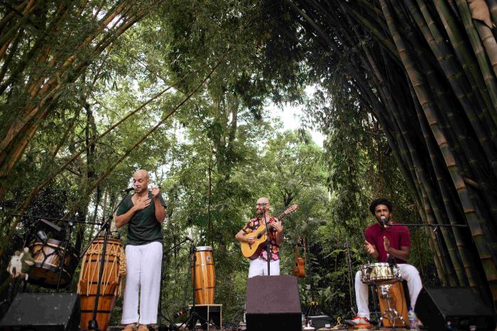 O evento reúne os músicos João Oliveira (@joaooliveiramusik), Jota Erre (@jotaerreoficial) e Kabé Pinheiro (@kabepinheiro), que juntos formam o trio responsável pelo projeto "Terra Batida". A proposta deste espetáculo é explorar e celebrar ritmos como samba, maracatu, congada e jongo, conectando tradições brasileiras com novas sonoridades e improvisações criativas.