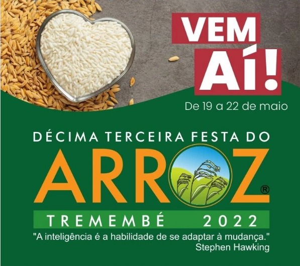 A 13ª edição da Festa do Arroz de Tremembé será realizada entre os dias 19 e 22 de maio. A tradicional Festa do Arroz acontecerá na Praça Geraldo Costa e terá como palco a histórica e centenária Estação Ferroviária Paulo de Frontin, além de diversas atrações gastronômicas, musicais e culturais.