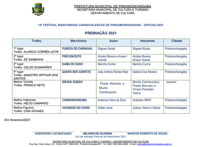 A Prefeitura de Pindamonhangaba, por meio da Secretaria de Cultura e Turismo, Departamento de Turismo, divulga os vencedores do 14º Festival de Marchinhas Carnavalescas de Pindamonhangaba - Virtual 2021.