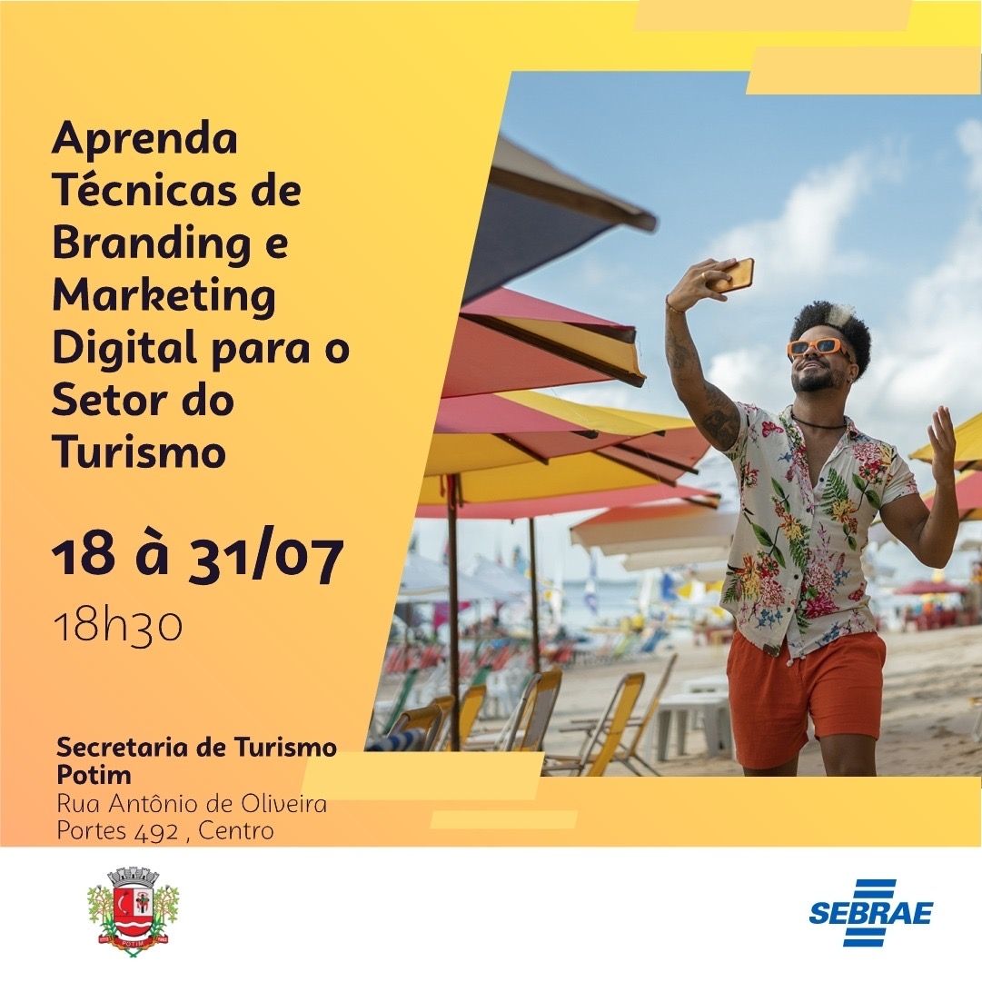 A Secretaria de Turismo de Potim, em parceria com o Sebrae, está com inscrições abertas para o curso gratuito de Técnicas de Branding e Marketing Digital com foco no setor do turismo. A capacitação será realizada de 18 a 31 de julho, de segunda a sexta-feira, sempre das 18h30 às 22h30, na sede da Secretaria de Turismo.