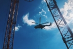Equipamento utilizado pela primeira vez no Brasil está sendo montado com ajuda de um helicóptero