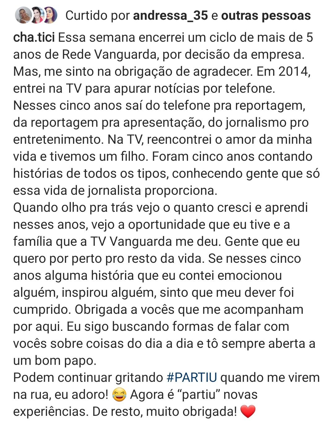 A apresentadora Ticiana Schvarcz foi demitida da TV Vanguarda nesta sexta-feira. De acordo com fontes ligadas à TV Vanguarda, a emissora passa por mudanças, inclusive de reforma de estúdios. Entre essas mudanças estão o fim do Madrugada Vanguarda e a demissão de Ticiana Schvarcz. A apresentadora se despediu do público pelas redes sociais. "Essa semana encerrei um ciclo de mais de 5 anos de Rede Vanguarda, por decisão da empresa. Mas, me sinto na obrigação de agradecer", escreve a apresentadora. Em outro trecho ela diz: "Se nesses cinco anos alguma história que eu contei emocionou alguém, inspirou alguém, sinto que meu dever foi cumprido".