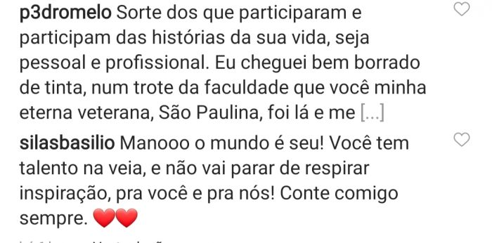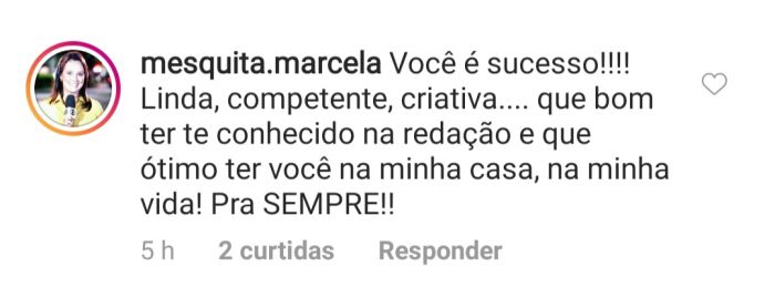 Colegas de trabalho desejaram boa sorte. "Sorte dos que participaram e participam da sua vida", disse o jornalista Pedro Melo. "Você é sucesso!!!!Linda, competente, criativa...", escreveu a jornalista Marcela Mesquita. "Você sempre será sinônimo de sucesso e competência", comentou o repórter Tiago Bezerra. Já o repórter cinematográfico Silas Basílio disse: "Você tem talento na veia, e não vai parar de respirar inspiração, pra você e para nós!".